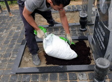 Цветники засыпаем слоем плодородного грунта, сверху которого укладываем мульчу. На этом работы на могиле оканчиваются – место захоронения преобразилось и, одновременно с этим, избавило владельцев от проблем прополки и постоянной грязи во время дождя.