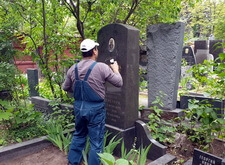 Практически сразу мы взялись за восстановление надписи: для этого её следовало покрыть специальным раствором. Перед тем, как приступить к надгробью, мы тщательно убрали на могиле: пропололи растущие у основания памятника цветы, а также убрали с территории участка весь мусор, который в последствие был вывезен с кладбища.